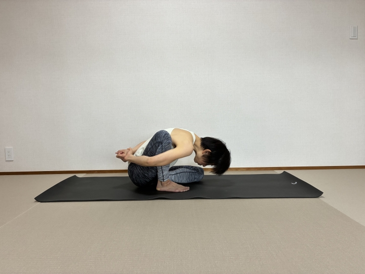 ②両腿を内側に回しこみ、骨盤から上体を倒します