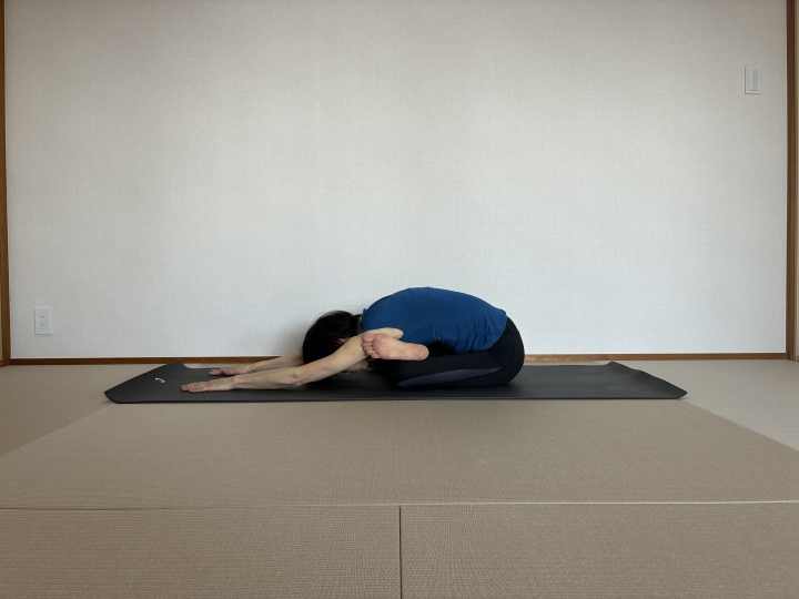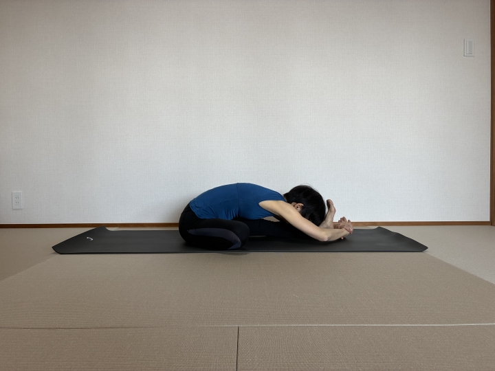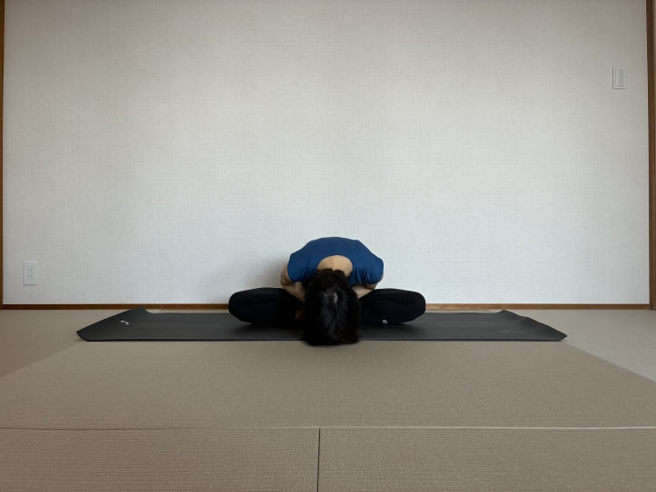 ③曲げた脚側の座骨をしっかり下ろし、両座骨に均等に体重をのせて前屈します