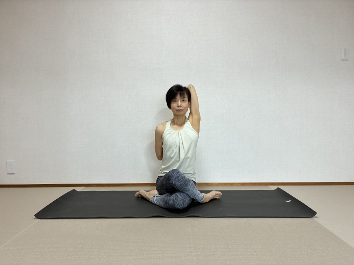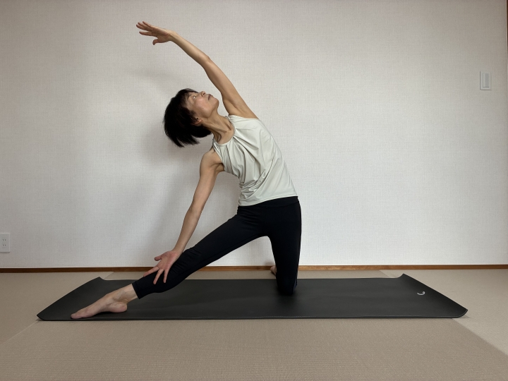 ③尾骨をすくい入れてなるべく真横に上体を倒し、両脇を長く伸ばします