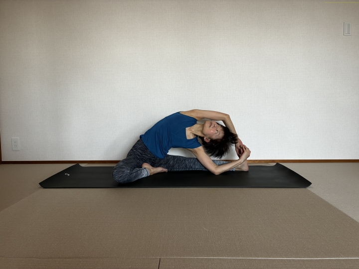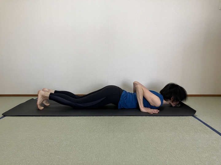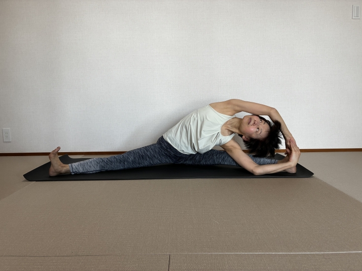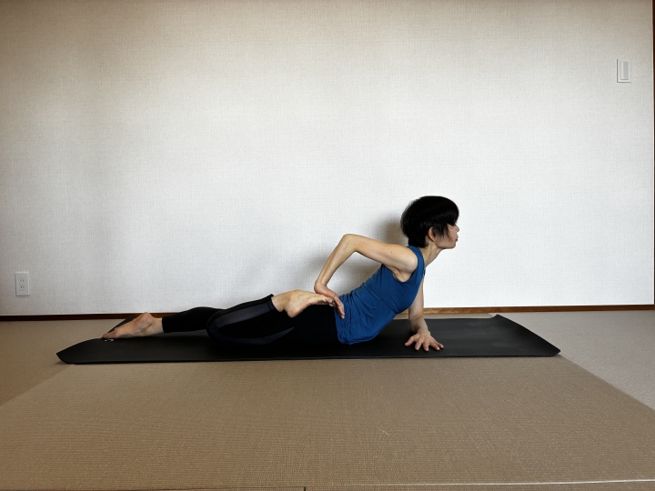 →背中で手を組まずに下側の手をマットに下ろし、上側の手は仙骨に添えます