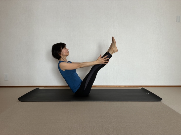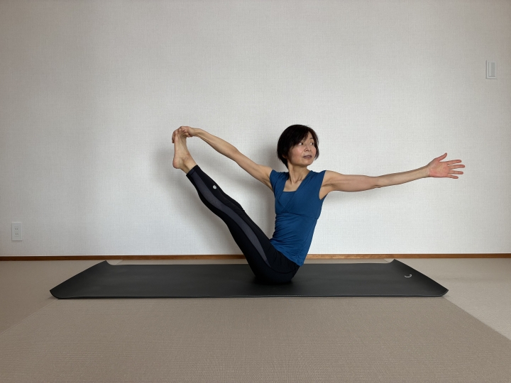 ②吸う息で胸と脚を引き上げ、吐く息で上体を捻じります