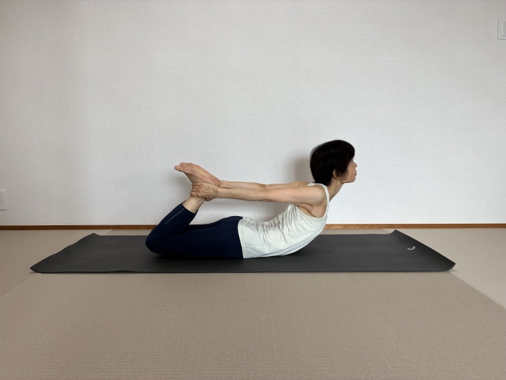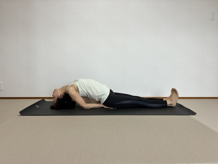 ③肩の前側を後方へ開き、背骨全体で大きなアーチを作ります